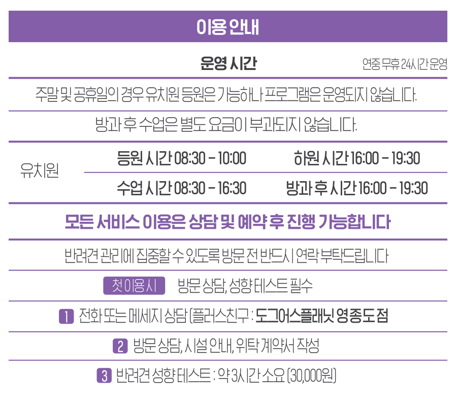인천광역시 영종도에 위치한 ‘도그어스플래닛 영종도점’은 넓고 쾌적한 공간과 반려동물 교육과 케어를 위한 전문 장비/시설을 보유하고 있습니다. 24시간 상주하는 전문 훈련사 인력으로 구성된 선생님들은 쾌적한 서비스와 반려견과의 교감을 위한 attitude를 조언해 드립니다.